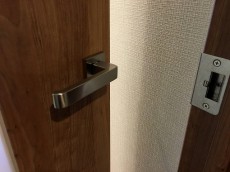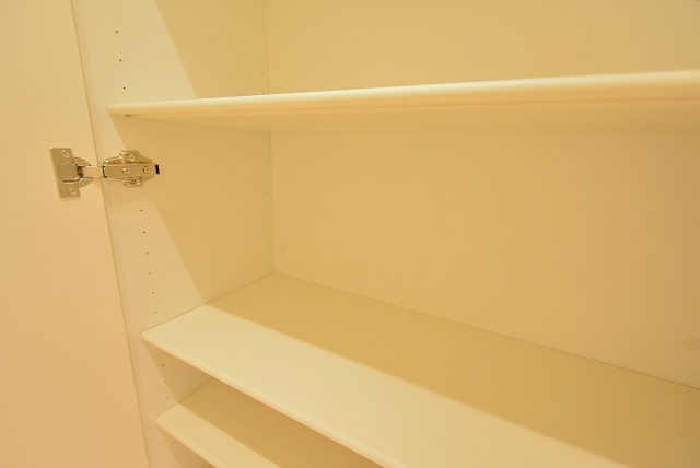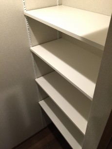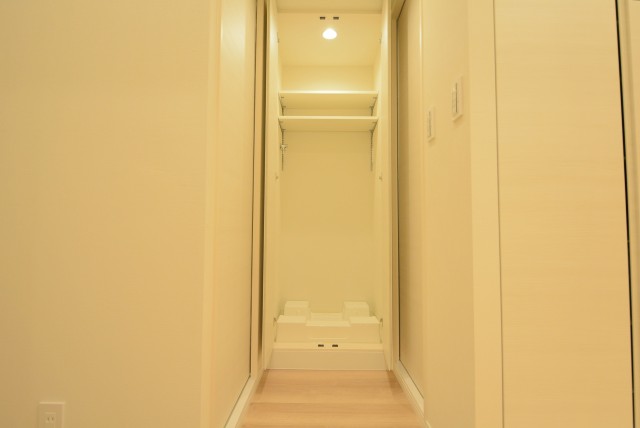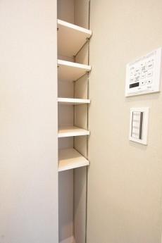 バスルーム出入り口の横には収納棚があり、リネン類の収納はバッチリです。
