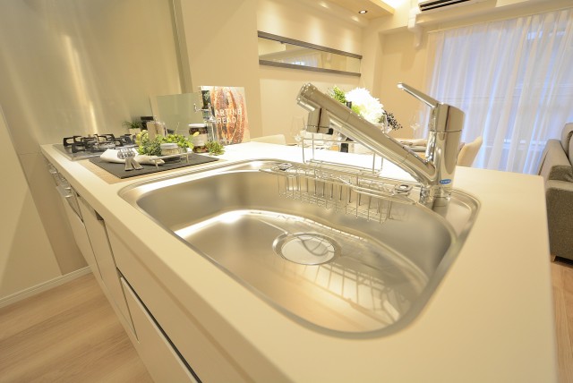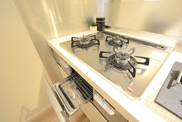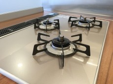 設備は3口ガスコンロ、グリル、浄水器一体型水栓が付いていて、オプションで食洗機も設置できます。