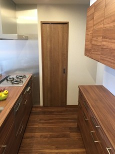 ワークトップは木調の高圧メラミン化粧板。キズがつきにくく、耐水、耐熱性にとても優れています。3つ口コンロはお料理好きの方には嬉しいですね♪シンクは大きめで使い勝手◎