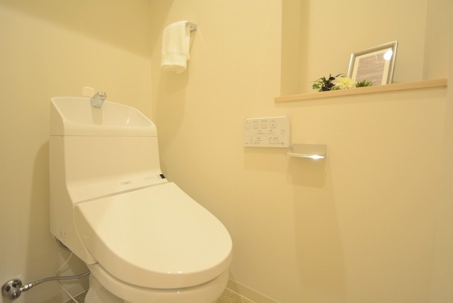 収納力もある手洗いキャビネットも設置されていて充実したトイレです。