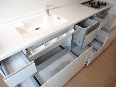 真っ白なシステムキッチンには上下たっぷりの収納と食器洗浄機も付いています。