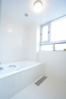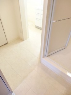 タイル張りの高級感のあるバスルームはサニタリールームの右側にあります。