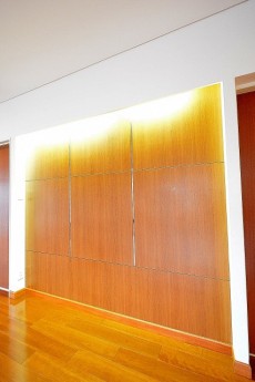 ウッド調のアクセントパネルが貼られていて、間接照明が照らします。