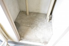 手洗い場下の観音開きの扉は中に水道管がはしっているので少し物が入れられる・・・