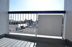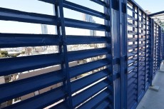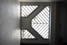共用廊下は、外廊下になっていますが、廊下の幅があるのでよっぽどの雨でなければ吹き込むことがなさそう。つきあたりの右手の筋交いがオシャレですね。