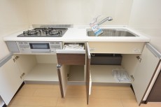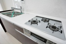 キッチンは収納スペースが多く、設備は3口ガス、グリルに浄水器一体型水栓が付いています。