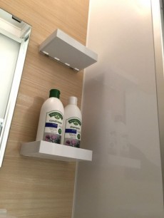 バスルームは、お部屋の木調との統一感を考えたナチュラルな木調のパネル☆ミラー横にシャンプーなどのボトルもキレイに並べて置ける棚があり、清潔感のある空間を保てますね◎