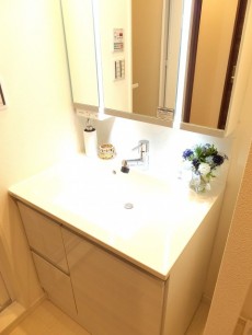 洗面室は洗面化粧台の他にトイレと浴室がまとまっていて脱衣室を兼ねています。洗面化粧台は身だしなみを整えるのに便利な三面鏡付き。鏡の間に照明が仕込まれているので影になることもありませんよ。三面鏡裏のキャビネットには洗面周りの細々したものをスッキリと片付けることが可能です。