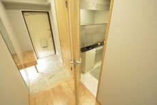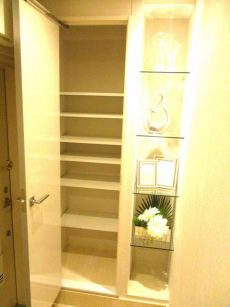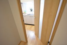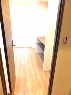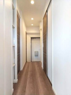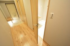 玄関から真っ直ぐに伸びた廊下には、お部屋へのドアと共に収納棚や洗濯機スペースなども並んでいます。洗濯機スペースは扉付き。収納かな?と思って開けたのでちょっとびっくりしてしまいました^^;)
