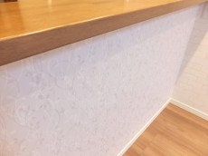 キッチン周辺のクロスはレンガ風だったり、花柄だったり、ちょっとかわいくなっています。
