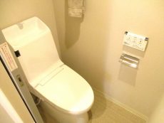 トイレはINAX製の洗浄機能一体型。トイレットペーパーストックや掃除道具を入れておける吊戸棚も付いています。