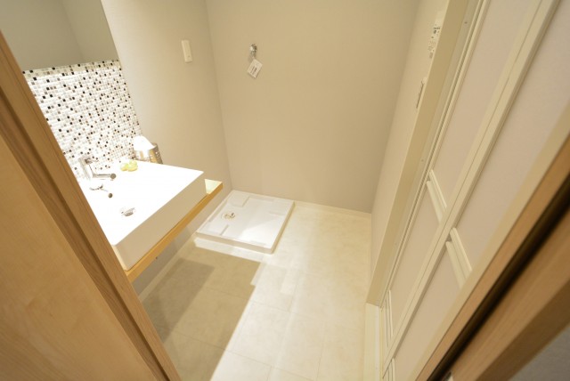 お隣のお部屋は、水まわりが一ヶ所にまとまった洗面室です。コンパクトな空間ですが、小回りが効くので作業がし易く家事の効率もアップしそうですよ♬
