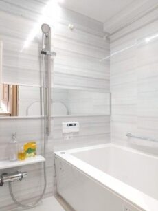 浴室は白をベースにモノトーンでまとめられた明るい雰囲気。追い焚き機能や浴室換気乾燥機などの便利機能も完備しています。天候を気にせず洗濯ができるのは嬉しいですね。