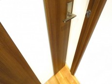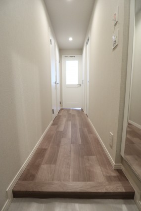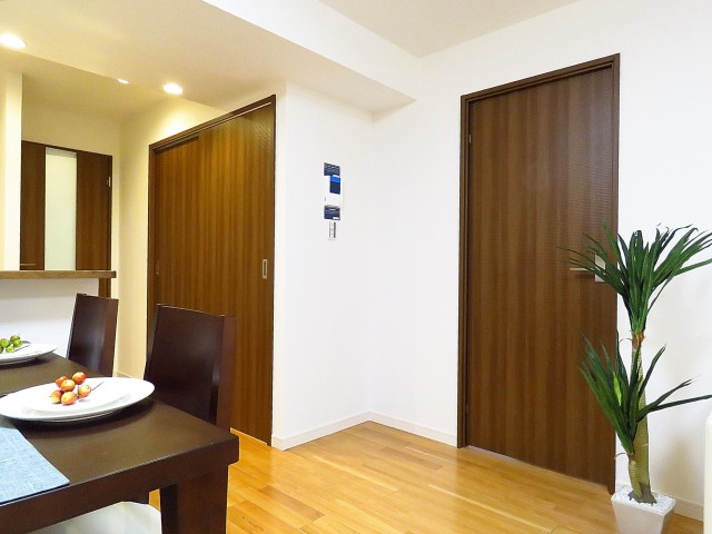 玄関をあがると目の前は廊下。ダークブラウンの建具で落ち着いた雰囲気です。手前の扉から順番にご紹介いたします。