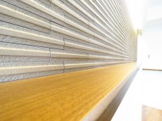 LDKの壁面には調湿・消臭など空気を快適に保つ効果のあるエコカラットが使われています。エコカラットがある部分はカウンターになっているので、インテリアを飾って楽しむのもいいですね。