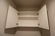 トイレは洗面室の向かい側。ウォシュレットとペーパーのストックの保管に便利な吊戸棚が設置されています。