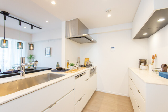 コンロ前にだけ壁が立てられた、解放感と使い勝手のバランスがとれたキッチンです。調理台にはデザイン性の高さに定評のある田中工藝製オリジナルシステムキッチンを使用。透光性を持つウィッチヘーゼルの天板が柔らかな雰囲気を醸し出しています。揃いのカップボードも設置され収納や作業スペースもたっぷり。食器洗浄乾燥機などの便利機能も充実しています。
