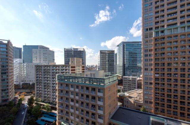 都会らしい眺めですね。高いビルが立ち並んでいますがそこはこちらも14階!ビル群の向こうには広い空が望めます。