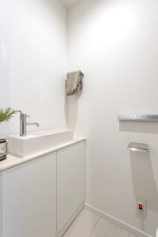 タンクレスのトイレはTOTO製洗浄機能一体型。お掃除をアシストしてくれる工夫もいっぱい詰まっています。手洗いカウンターの下は収納になっているので掃除道具やトイレットペーパーのストックを入れておくのに便利ですよ。