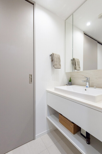洗面室には洗面化粧台の他に洗濯機スペースと浴室があって脱衣所も兼ねています。洗面化粧台は身だしなみのチェックに便利な三面鏡付き。裏がキャビネットになっているので洗面まわりの細々としたものをスッキリ収納可能です。