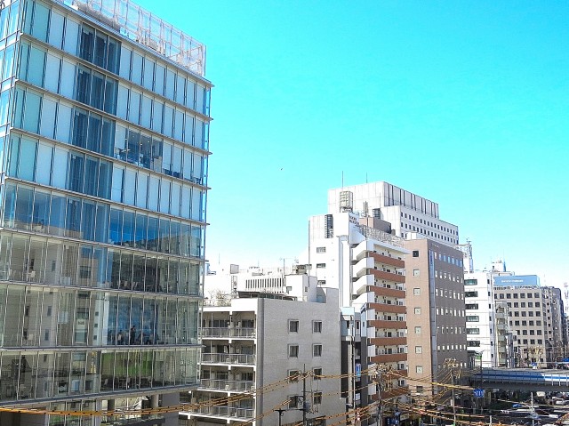 正面の眺望。山手通りを挟んでビルが立ち並んでいます。