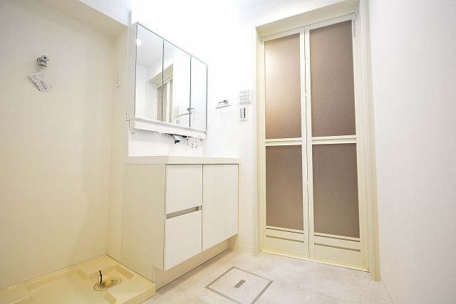 洗濯機置場と洗面化粧台はお隣どうし。鏡の裏、引き出し、棚など収納スペースも豊富です。ちなみに洗濯機置場上の棚のところに分電盤があります。