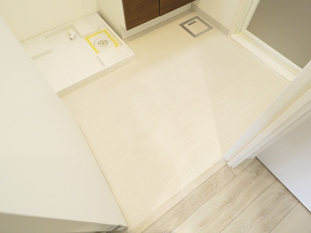 洗面台横のランドリースペースには洗剤などを置いておくのに便利なスペースもありました。