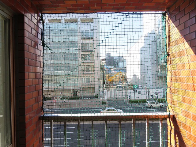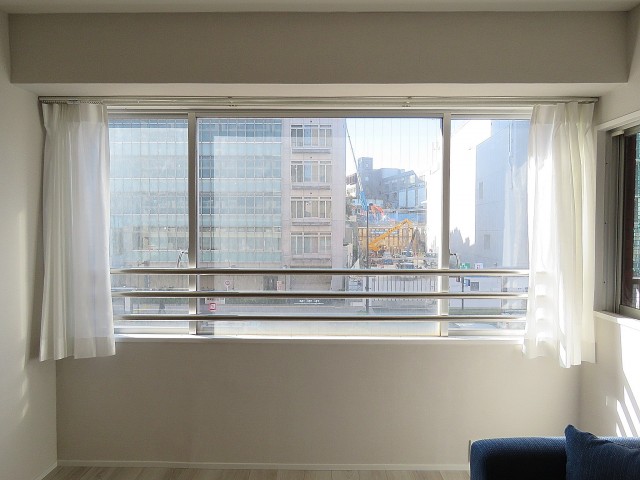 バルコニーにはネットが張ってありますが、眺望はエントランス前の山手通りを挟んでビルが立ち並ぶ風景です。