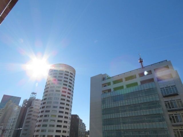 上を見上げるとビル越しに太陽がキラーンと見えました。