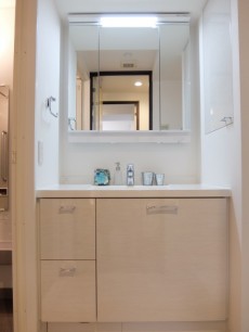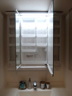 三面鏡の裏の収納に加えて、右手にも備え付けの収納がありますので、