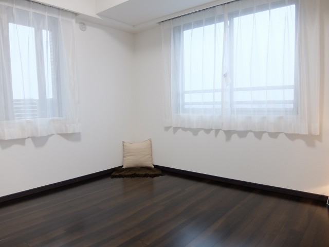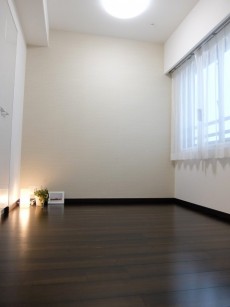 廊下を右に曲がり突き当たりが南西向きの角部屋、左手が西向きのお部屋、右手が浴室になります。