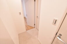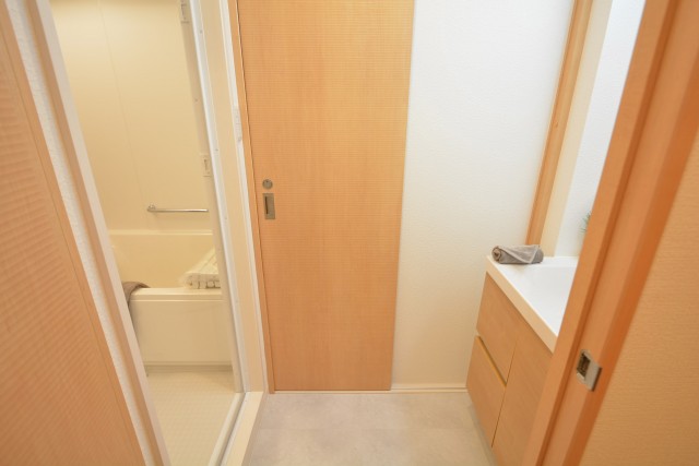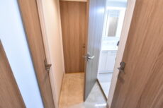 廊下を進んで左側は洗面室。洗面化粧台、トイレ、バスルームがまとまっています。