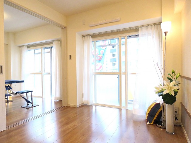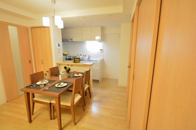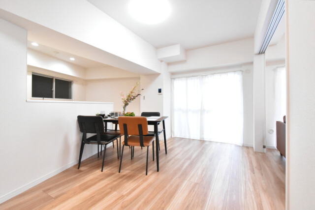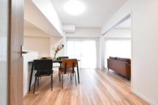 という訳で、隣の洋室とつなげてみた様子です。モデル家具も奥の洋室をリビングとして使う感じになっています。ご家族構成などで奥のお部屋を洋室として使う場合は、ちょっと低めの寛げるダイニングセットなどを置く方がゆとりがあっていいかもしれませんね。
