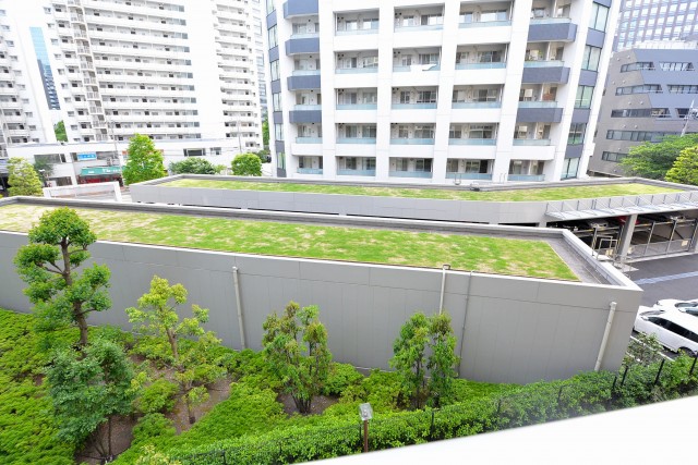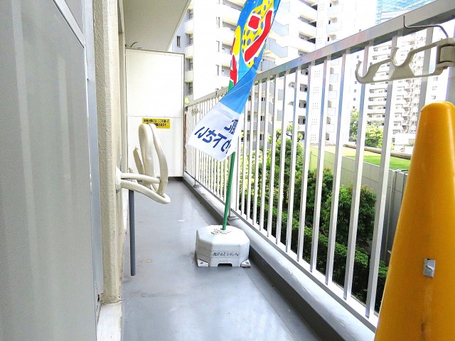 バルコニーの外は大きなマンションがずらりと建ち並んでいる風景です。