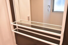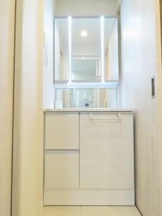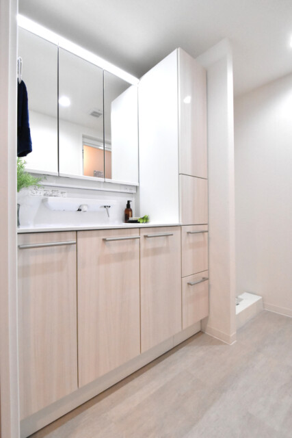洗面台は身だしなみのチェックに便利な三面鏡付き。上部に付けられた照明のおかげで、鏡を見る時に影になったりする事もありません。