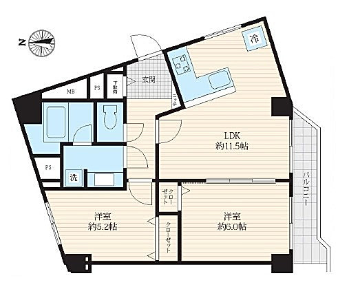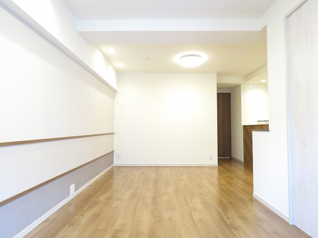 南向きのバルコニーに面した明るいお部屋です。間取り図を見ると五角形の形をしているのですが、あまりそんな感じはしませんね。左奥がキッチンになっていて手前がリビングダイニングですが、ダイニングテーブルとソファーセットを置けるかは微妙なところです。
