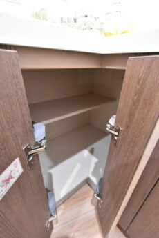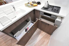 調理台下はぜ~んぶ収納になっています。メインは出し入れしやすいスライドキャビネット。ぎっしり詰めても中が確認しやすいのも有難いですね。コーナー部分も無駄にはしません。出し入れは多少しづらいですが収納力はなかなかです。