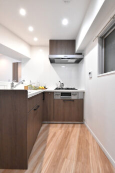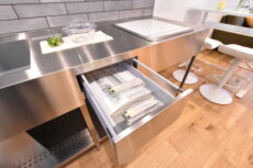 コミュニケーションが取りやすく、お料理中もご家族やお友達との一体感があるキッチンです。生活感の出やすいキッチン内が目立たないのも嬉しいポイント。L字型で作業スペースもたっぷりなので思う存分腕が振るえますよ(^^)
