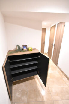 正面左にはロータイプのシューズボックス。上部のカウンターには、お気に入りの小物や写真などを置いてインテリアを楽しめます。
