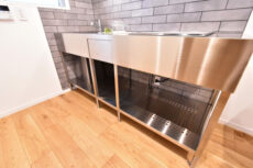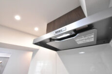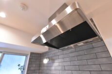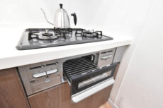 コンロは3口、グリルも付いています。窓があるとはいえ、オープンキッチンなので調理中は換気扇を忘れないよう気を付けましょう。少し早めに回し始めると効果的らしいですよ。