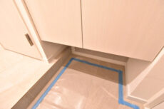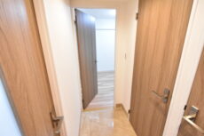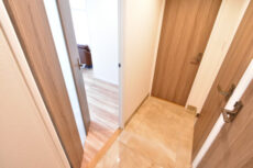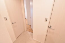 玄関をあがると目の前に廊下がまっすぐのびており、洗面室、LDK、洋室の扉が並んでいます。順番にご紹介いたします。