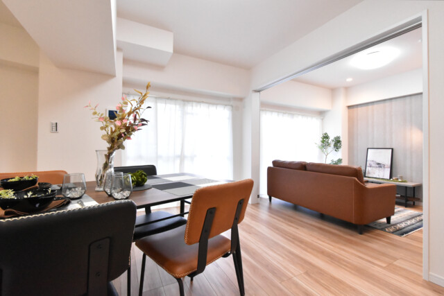 LDKと洋室の間の引き戸を開放して2部屋をつなげると一体感のある広々とした空間になりました。つなげて使ったり、独立させて使ったりと生活シーンに合わせてフレキシブルにご利用いただけます。