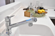 水栓は浄水機能付きシャワー水栓。切り替えひとつで気軽に美味しいお水を使えます。ノズルが伸びてシンクを流したりにも便利。