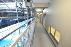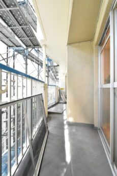 広いエレベーターホールから外廊下を進みます。160戸の大規模マンションだけあって長い廊下ですね。