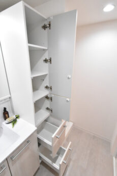洗面化粧台は鏡の裏、引き出しと収納スペースが豊富。鏡の間にライトが入っているので顔に影ができにくく、身だしなみもバッチリ整えられます。