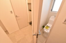 正面のドアがトイレです。ここも白いクロスでとても明るく、上に棚が付いているのでスッキリ収納も出来ちゃいます♪