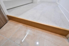洗面室には洗面台の他に、浴室、洗濯機スペースがまとまっていて、脱衣所も兼ねています。入浴中にお洗濯が出来て効率的ですね。少々段差があるので足元にお気を付けください。