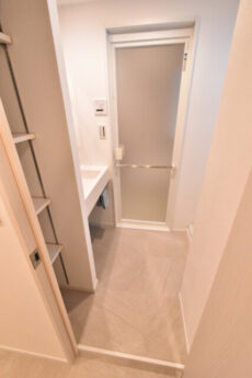 その左が浴室乾燥機付のバスルーム。ここも白基調のパネルが明るさを演出しています。