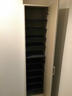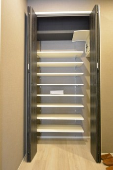 正面突き当りには、トールサイズのシューズボックスがあります。可動式の棚なので、靴のサイズに合わせてご自由にアレンジしてください☆
