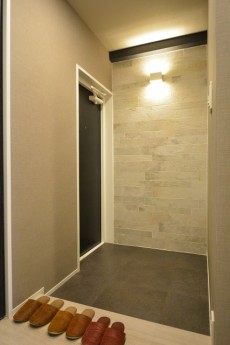 ではお部屋の中へ。石の風合いが感じられるタイルとブラケット照明が目をひく玄関ホール。人の気配で自動で照明が消灯する人感センサーもついており、機能面もバッチリです。インターホンは来訪者の顔が確認できるTVモニターがついています。